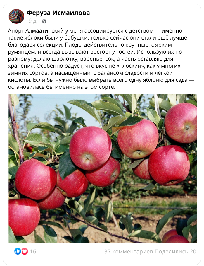 Апорт Алматинский - ўзбек селекционерлари томонидан яратилган ва афсонага айланган олма нави. Вақт ўтиши билан у боғлардан деярли ғойиб бўлди ва экиш материалини топиш деярли имконсиз эди.
